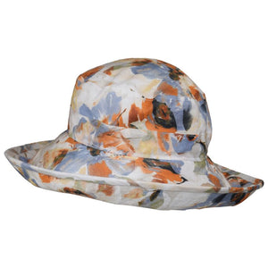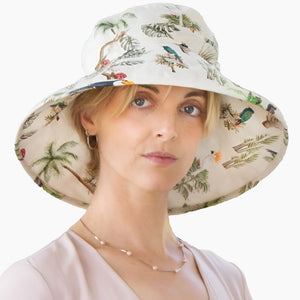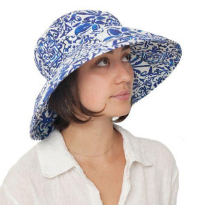 This wide brim, lightweight linen hat by Puffin Gear® has a 4.5" brim for maximum sun protection. The wired brim stays in place rolled up or down. Beautiful prints inspired by our favourite garden oases.  Choose from lush tropical fauna, a Mediterranean courtyard cafe mosaic, the vivid colour splashes of waves at the sea, botanical garden blooms or tranquil pond flora.