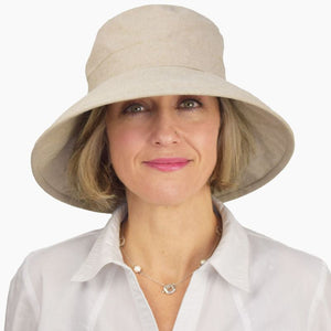 Puffin Gear®'s clothesline linen garden hat has a 4" wide oval brim. Wired brim can be rolled up or down. Enjoy the entire day puttering in your garden in this UPF 50+ sun protection rated hat. Hats with this rating block at least 97.5% broad spectrum UVA and UVB radiation.