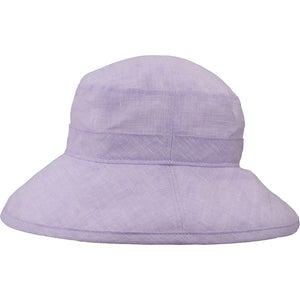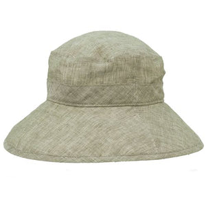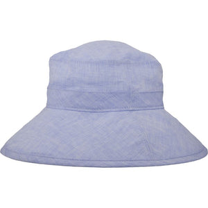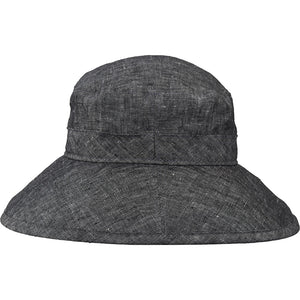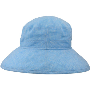 This lightweight linen chambray garden hat by Puffin Gear® has a 4" brim for good sun coverage while allowing a field of vision for sight seeing or working in garden. A chambray weave has an alternating white thread adding texture while maintaining the lightweight breath-ability of linen. Wired brim can be rolled up or down.