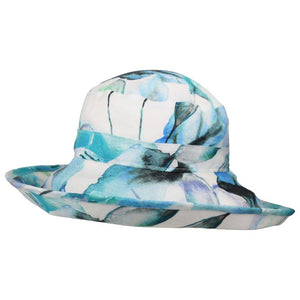 This wide brim, lightweight linen hat by Puffin Gear® has a 4.5" brim for maximum sun protection. The wired brim stays in place rolled up or down. Beautiful prints inspired by our favourite garden oases. Choose from lush tropical fauna, the blues of a Mediterranean courtyard cafe, the vivid colour splashes of waves at the sea, or your favourite garden blooms