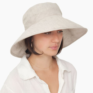 Hand wash your hat in cool or lukewarm water with a gentle detergent. We prewash our linen fabrics so shrinkage is not a concern. Our wide brim hats have a millinery wire at the edge of the brim to prevent flopping and the wire may be bent by a washing machine. Air dry your hat in the shade. Placing it over a vase prevents wrinkling in the crown. Iron the brim if needed using a slightly damp towel between the iron and brim. A steaming tea kettle will remove wrinkles from the crown. Do not place hot iron directly on inside crown lining. Do not bleach. Do not dryclean. |
