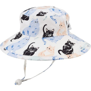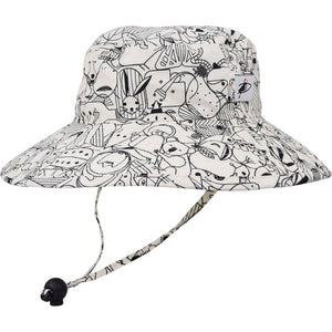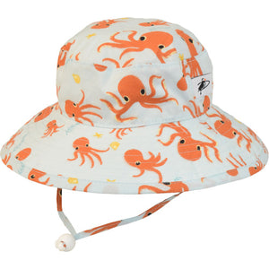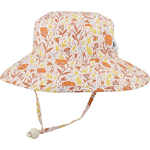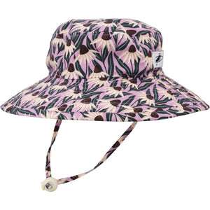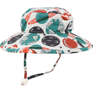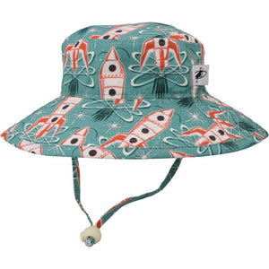 Beautiful organic cotton print toddler and child sun hats you'll love! Rated UPF 50+ with a wide brim for maximum sun protection. A chin tie with cord lock and breakaway clip keeps hat safely secure.  Hats are preshrunk and machine washable.  Fabulous prints include vintage space age rockets, Charlie Harper sketches or pretty garden florals.